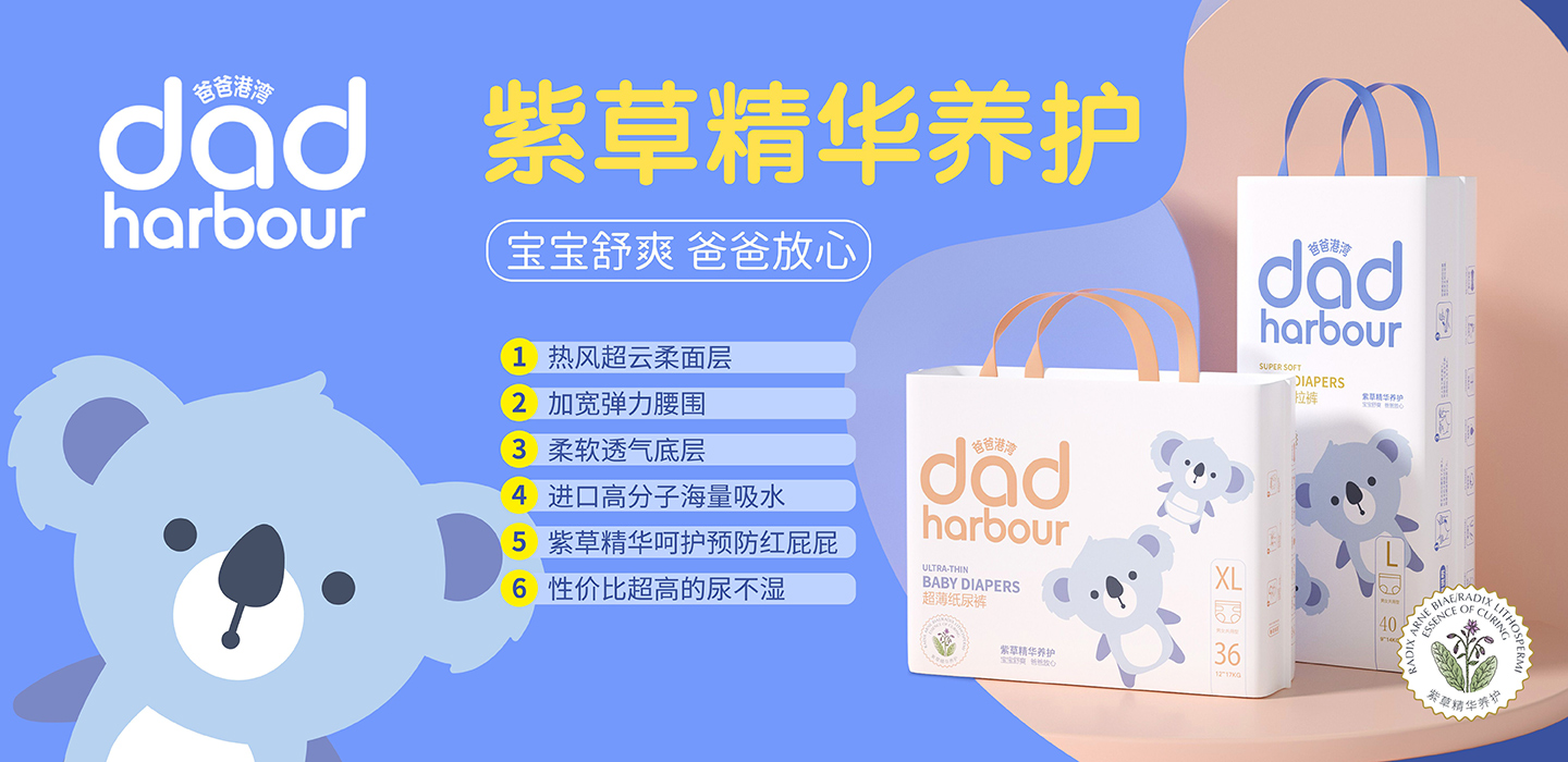 品牌名稱:爸爸港灣 主營產(chǎn)品:爸爸港灣紙尿褲,爸爸港灣拉拉褲 品牌特色:萃取天然紫草精華 抑菌守護(hù)