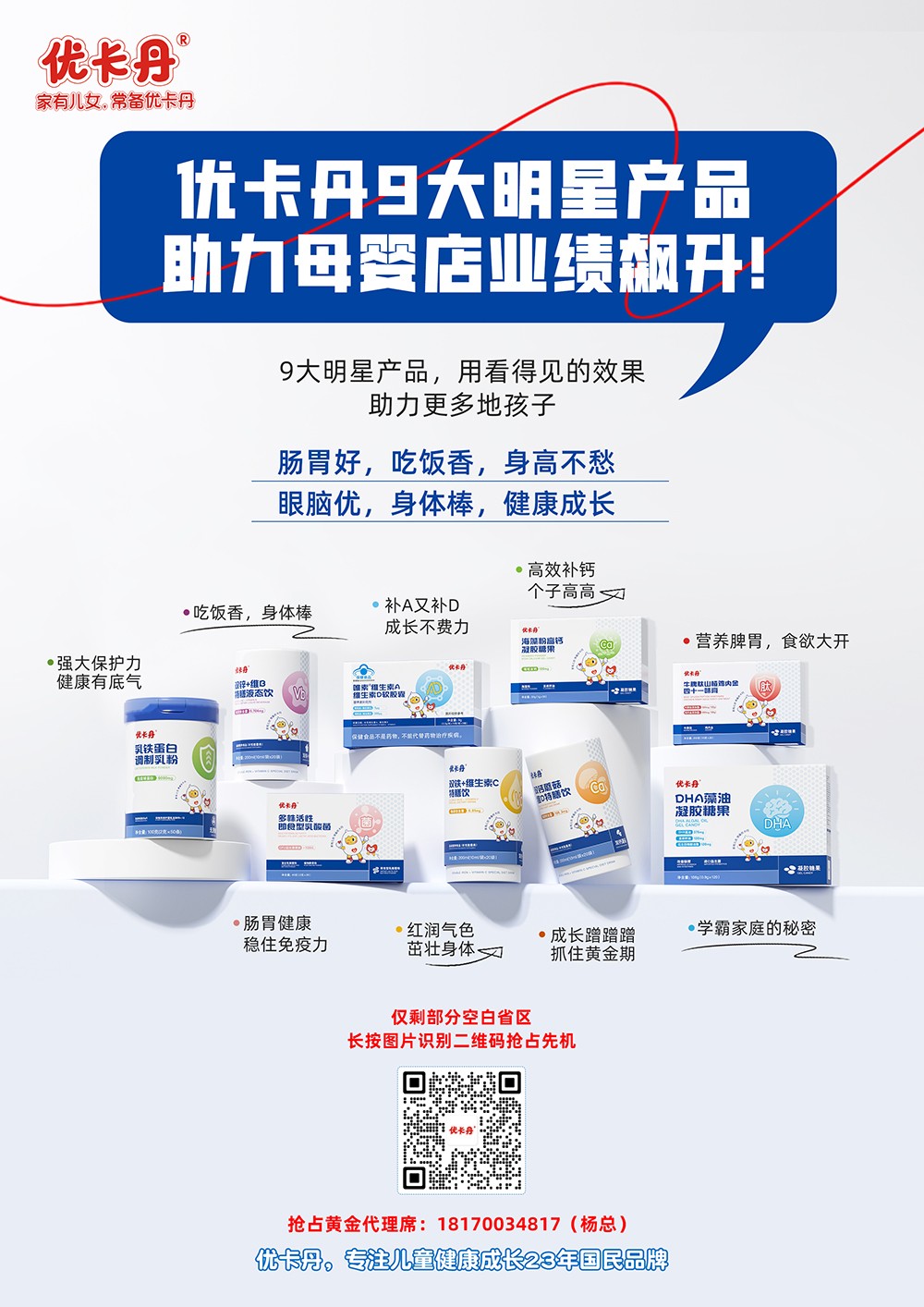 2022年,優(yōu)卡丹布局大健康行業(yè),開啟“制藥+功能性母嬰”雙航母格局。優(yōu)卡丹大健康誕生至今,始終秉承嚴(yán)苛制藥標(biāo)準(zhǔn),嚴(yán)謹(jǐn)定義功能性健康產(chǎn)品,從科技研發(fā)、原料探尋、科學(xué)生產(chǎn)出發(fā),專研更適合中國嬰幼兒和兒童青少年成長的零輔食、保健膳食、洗護(hù)日化、日常用品等家中常備的功效調(diào)理型安心產(chǎn)品,用“醫(yī)研育養(yǎng),呵護(hù)成長”的品牌理念,“以更好為更優(yōu)”的品牌精神,為中國家庭帶來更可靠、更值得信賴的健康選擇,全方位守護(hù)中國家庭兒女健康成長。醫(yī)研育養(yǎng),呵護(hù)成長!家有兒女,常備優(yōu)卡丹!
