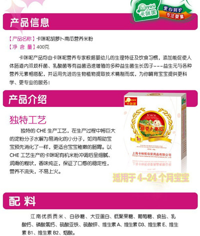 卡咪呢有機(jī)米粉系列是專為中國寶寶設(shè)計(jì)的營養(yǎng)輔食,選用有機(jī)大米,科學(xué)搭配維生素AD等維生素,還特別添加;撬、DHA、AA等有助智力發(fā)育的營養(yǎng)成分,富含15種營養(yǎng)素,F(xiàn)上海卡咪呢母嬰用品有限公司面向全國空白市場區(qū)域誠招卡咪呢有機(jī)米粉代理商。