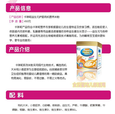 卡咪呢有機(jī)米粉系列是專為中國(guó)寶寶設(shè)計(jì)的營(yíng)養(yǎng)輔食,選用有機(jī)大米,科學(xué)搭配維生素AD等維生素,還特別添加牛磺酸、DHA、AA等有助智力發(fā)育的營(yíng)養(yǎng)成分,富含15種營(yíng)養(yǎng)素,F(xiàn)上海卡咪呢母嬰用品有限公司面向全國(guó)空白市場(chǎng)區(qū)域誠(chéng)招卡咪呢有機(jī)米粉代理商。