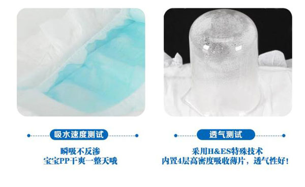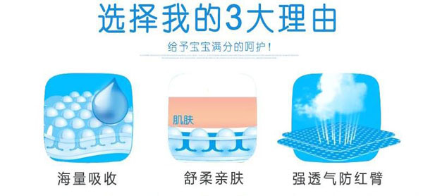 高分子吸收芯體,選用特殊復(fù)合芯體,吸收更快、更強(qiáng)韌、不易斷層。3D立體雙層防護(hù),加強(qiáng)防漏能力能更好阻隔尿液外溢。雙層舒爽芯,進(jìn)口住友+三大雅高分子完美配比,瞬間吸收、牢固鎖水。親膚透氣底膜,良好的透氣性的PE膜,形成有效的縱向?qū)α骺焖賹?dǎo)出廢氣和濕氣,沒有紅屁屁,讓寶寶的皮膚盡情的呼吸。360°雙層立體防側(cè)漏,寶寶怎么動(dòng)都不怕。