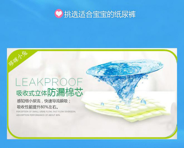 柔薄芯層結(jié)構(gòu),采用全芯高科技結(jié)構(gòu)設(shè)計(jì)、薄軟透氣、零接觸摩擦感、不起坨、不斷層、輕輕的呵護(hù),給寶寶體貼的愛。綿柔無紡布透氣底膜,及時(shí)散發(fā)悶熱濕氣,減少寶寶皮膚的刺激及傷害。全新3D打孔大珍珠面層,瞬間吸收,加倍干爽,連通吸收芯成(多層鎖水)系統(tǒng),有效吸收和鎖住更多尿液,讓寶寶屁屁更加干爽。雙重防漏立體設(shè)計(jì),舒適柔軟貼合腿部,防止尿尿往兩邊側(cè)漏,給寶寶自由自在,盡情活動(dòng)的舒爽空間。人性化合身曲線剪裁,專為中國(guó)寶寶設(shè)計(jì)的合身檔剪裁,更加貼合寶寶,腿部及臀部曲線,減少腿部摩擦與壓力。背部彈性腰圍貼身防后漏,無論寶寶坐、騎、爬等,大環(huán)腰彈性腰圍能自然伸縮,貼身服帖。