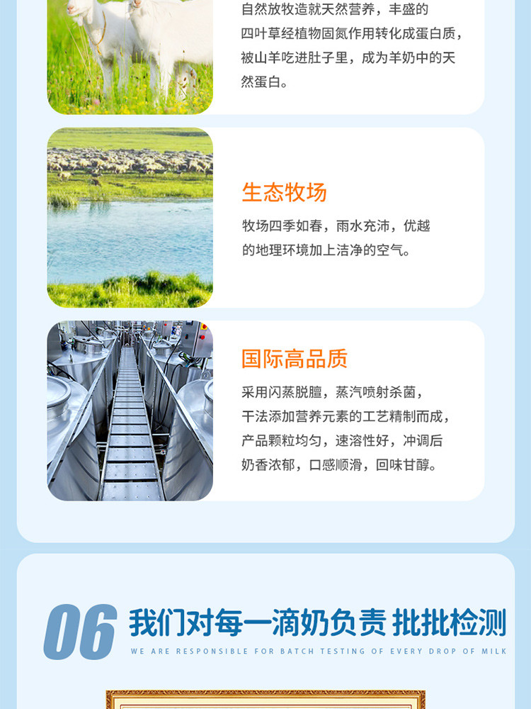 采用閃蒸脫膻,蒸汽噴射殺菌,干法添加營養(yǎng)元素的工藝精制而成,產(chǎn)品顆粒均勻,速溶性好,沖調(diào)后奶香濃郁,口感順滑,回味甘醇。
