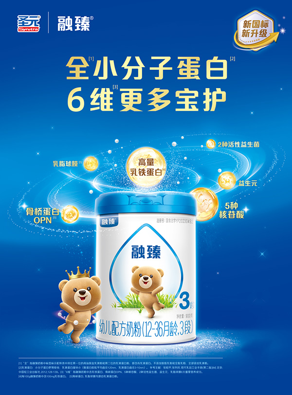 圣元融臻新國標(biāo)奶粉采用的是全乳清蛋白配方,乳清蛋白的含量高達90%以上,乳酪比9:1,與初乳蛋白的比例保持一致,好消化,易吸收!針對寶寶生長發(fā)育的需求,特別添加了6維寶護因子,每100g添加乳鐵蛋白100mg、益生元3100mg、50mg的5種核苷酸;另外還添加了2種活性益生菌,乳脂球膜以及骨橋蛋白OPN,6重保護因子,助力寶寶擁有超強的自護力。