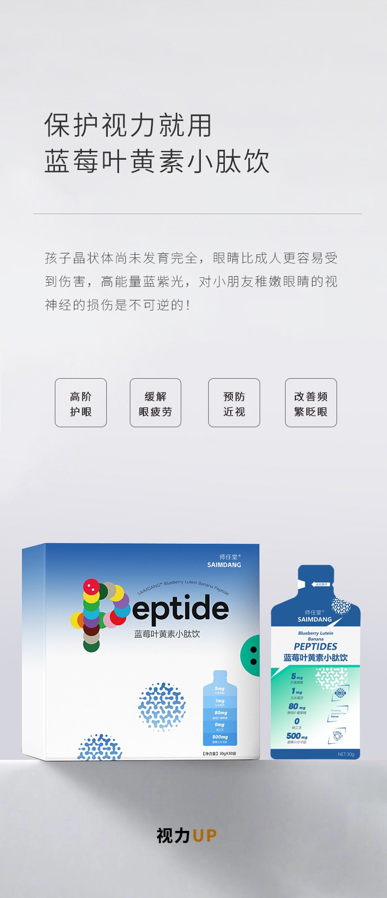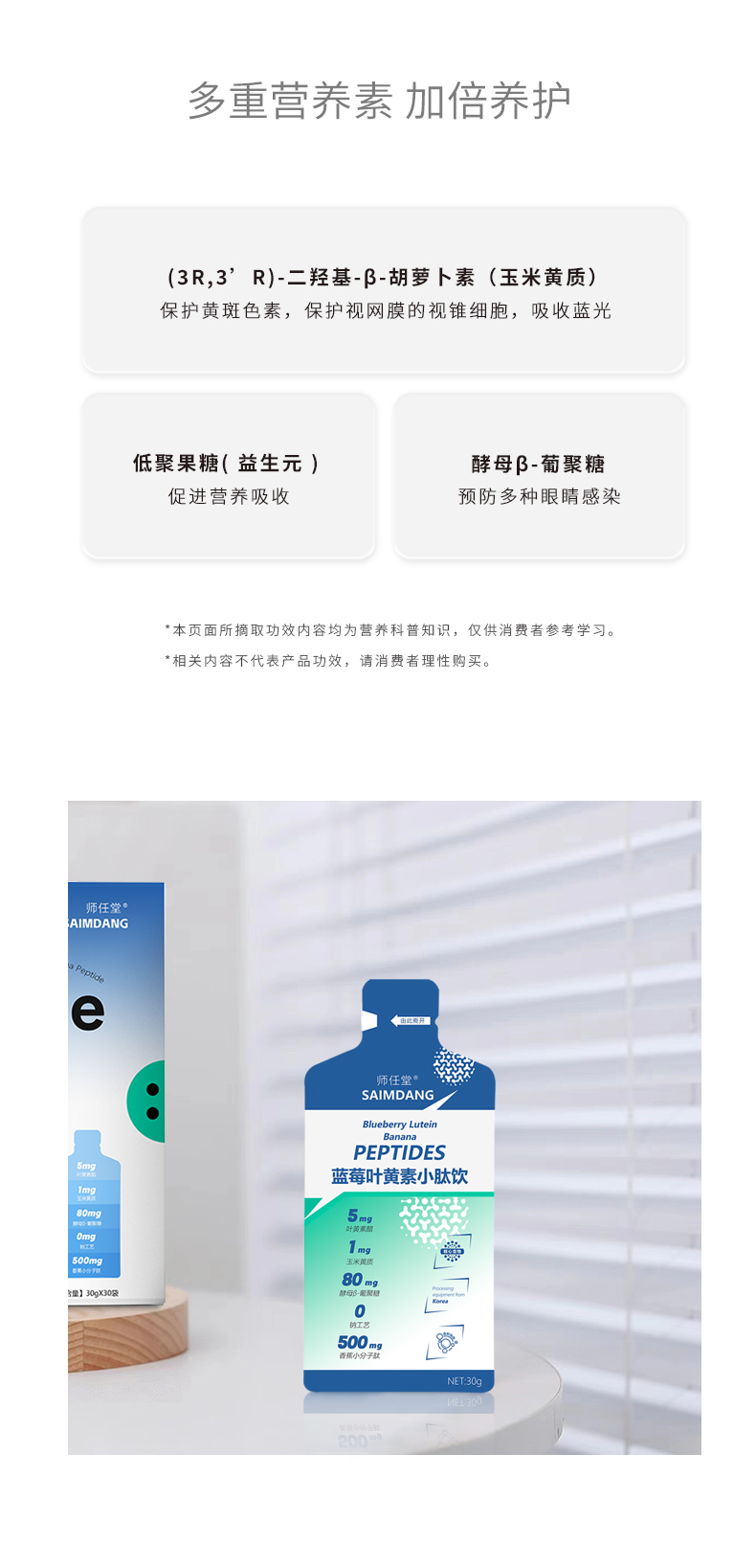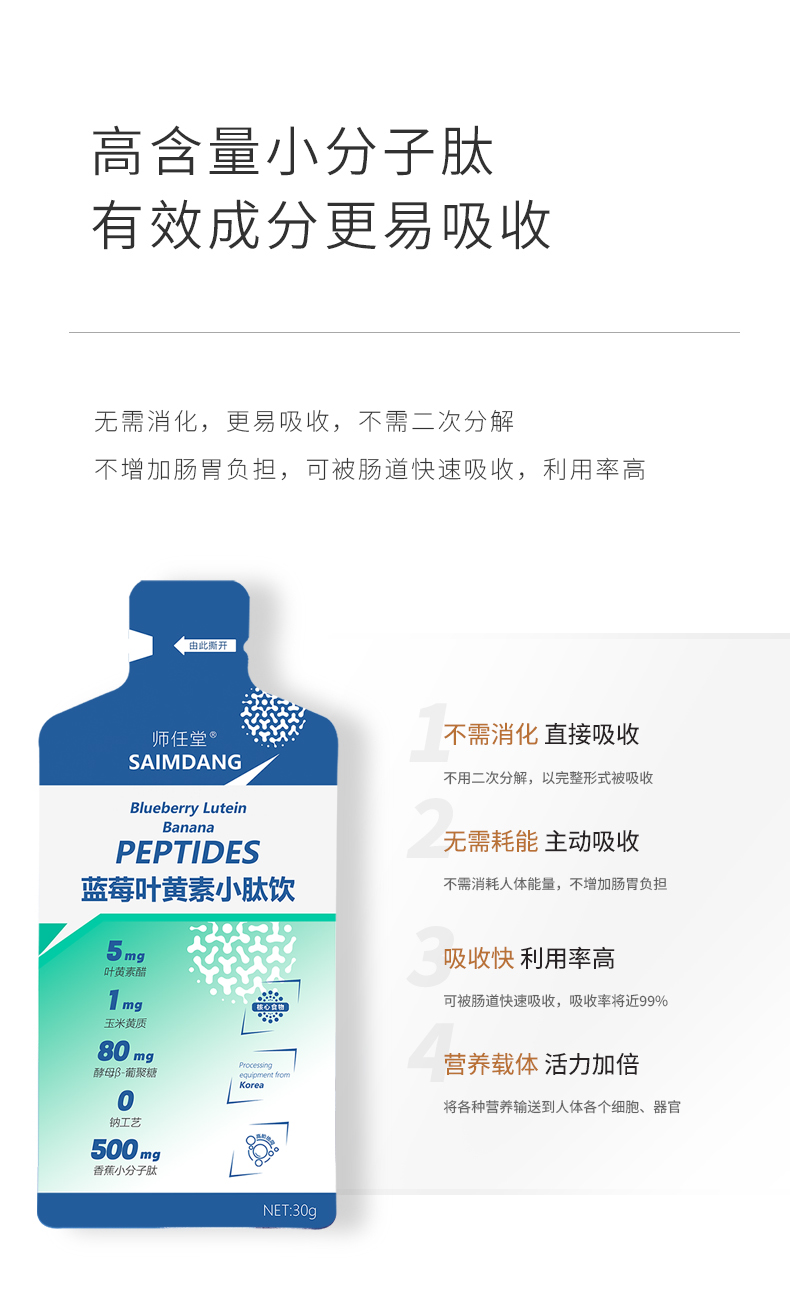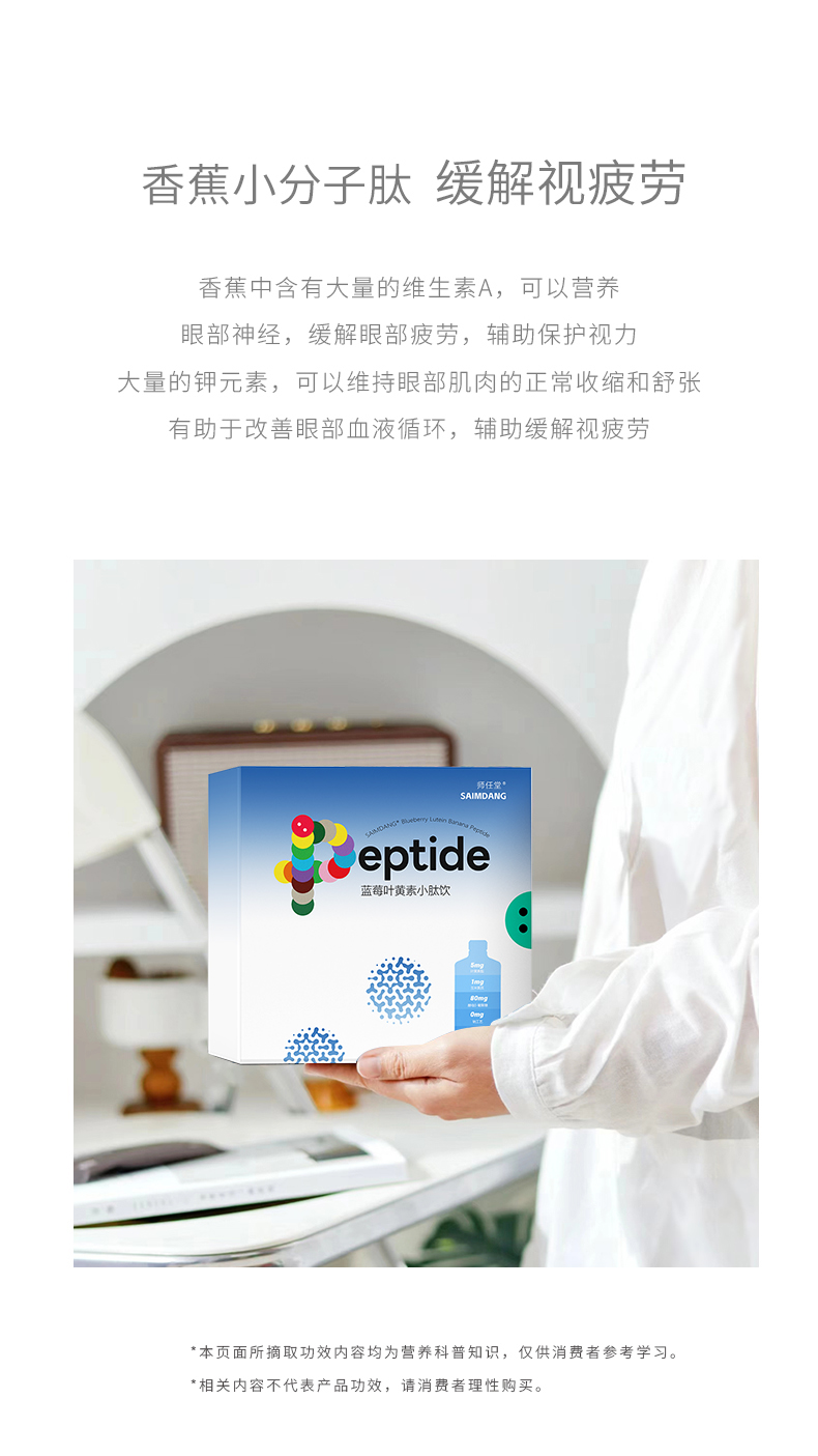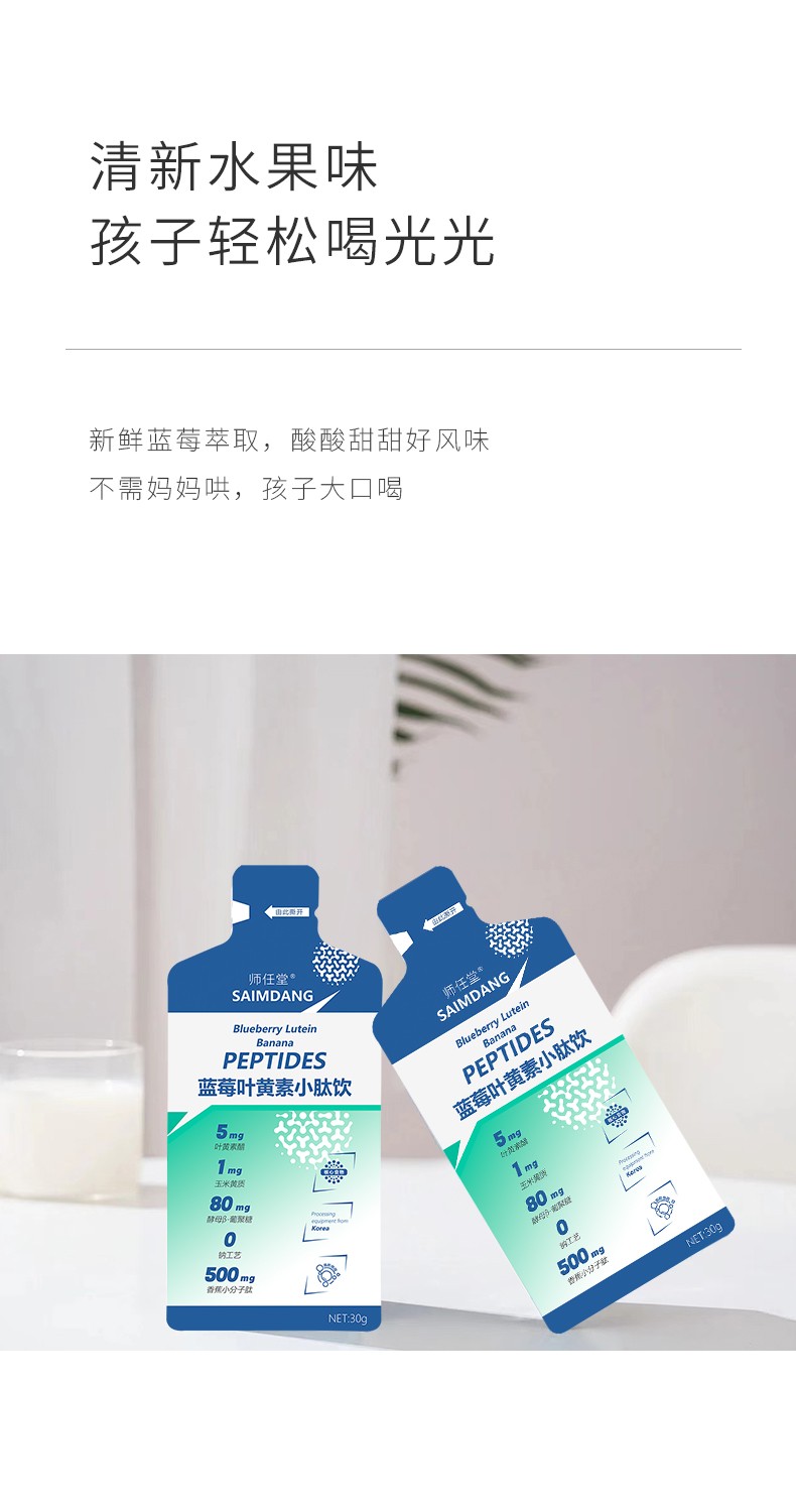 師任堂藍(lán)莓葉黃素小肽飲,少年兒童專研配方,“葉黃素酯+玉米黃質(zhì)”5:1黃金比例,科學(xué)護(hù)眼。搭配藍(lán)莓、低聚果糖(益生元)、酵母β-葡聚糖,特別添加香蕉小分子肽,多種營養(yǎng)協(xié)同補(bǔ)充,加倍養(yǎng)護(hù),抵御強(qiáng)藍(lán)光,滿分護(hù)視力!高含量小分子肽,成分更易吸收,不增加腸胃負(fù)擔(dān)。