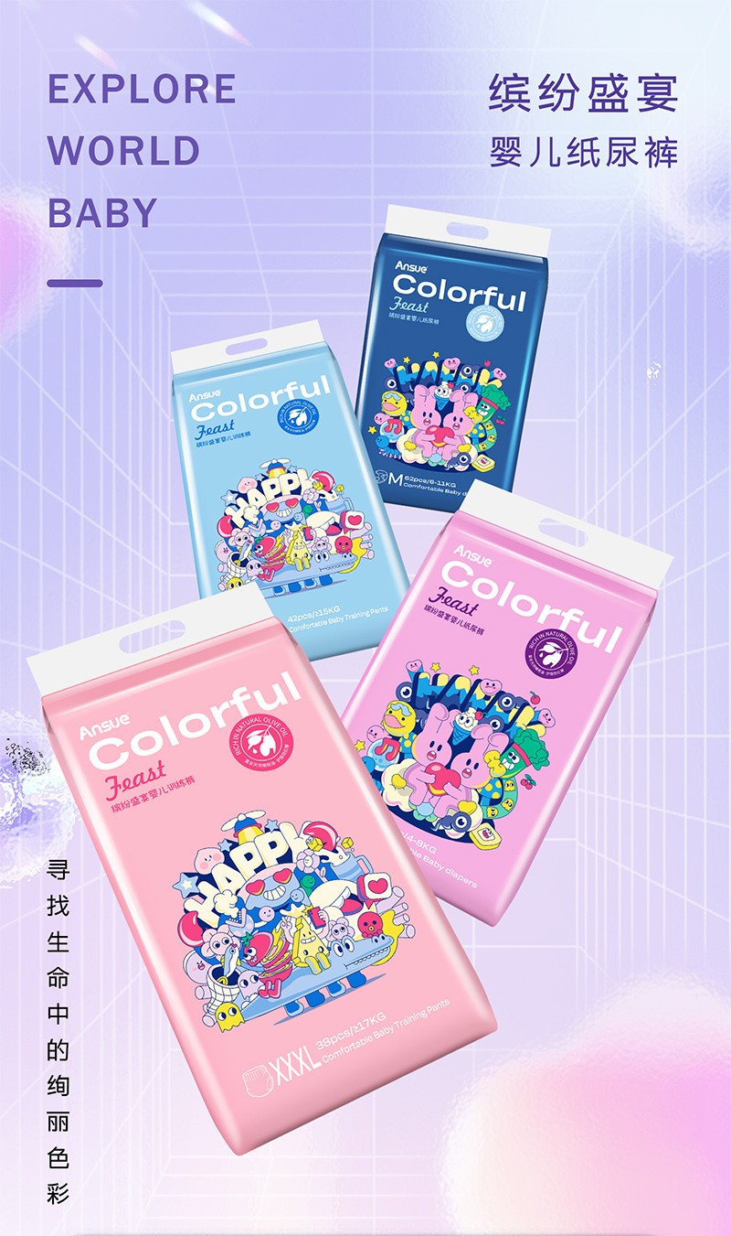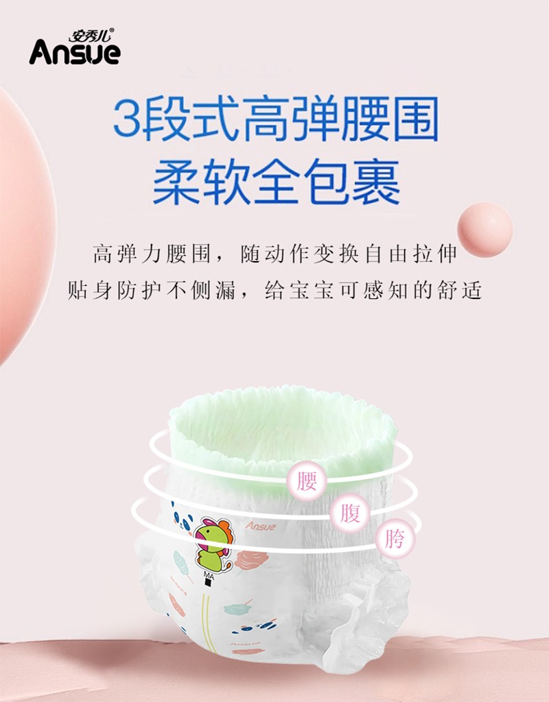 繽紛盛宴嬰兒紙尿褲/拉拉褲,云般柔軟,專為嬰兒肌,多彩設(shè)計+6代芯體,守護(hù)寶寶每一步。1片瞬吸,8次尿量。瞬吸高分子,一夜一片睡香香;3D表層+智選優(yōu)材,筑牢“屁屁防護(hù)盾”;3D雙層柔點觸感,拒絕潮濕,時刻干爽親膚;多重品質(zhì)檢驗,嚴(yán)選優(yōu)材,安全體驗有保障;3段式高彈腰圍,柔軟全包裹,隨動作變換自由拉伸,貼身防護(hù)不側(cè)漏,給寶寶可感知的舒適;萃取橄欖油精華,呵護(hù)嬌嫩肌,有效防紅臀。搭配科學(xué)護(hù)理提示,換褲清潔、過敏應(yīng)對全涵蓋。選安秀兒,給寶寶“臀”級寵愛~