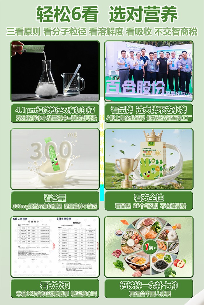 百合康推出綠冠軍鈣鐵鋅營(yíng)養(yǎng)飲,創(chuàng)新采用4.1µm超微粒徑技術(shù),一袋即可補(bǔ)充鈣、鐵、鋅等7種關(guān)鍵營(yíng)養(yǎng)素。產(chǎn)品特別添加天然維生素K2和維生素D3,并實(shí)現(xiàn)35項(xiàng)0添加,不含18項(xiàng)常見(jiàn)過(guò)敏原,由A股上市企業(yè)生產(chǎn),為兒童營(yíng)養(yǎng)補(bǔ)充提供新選擇。