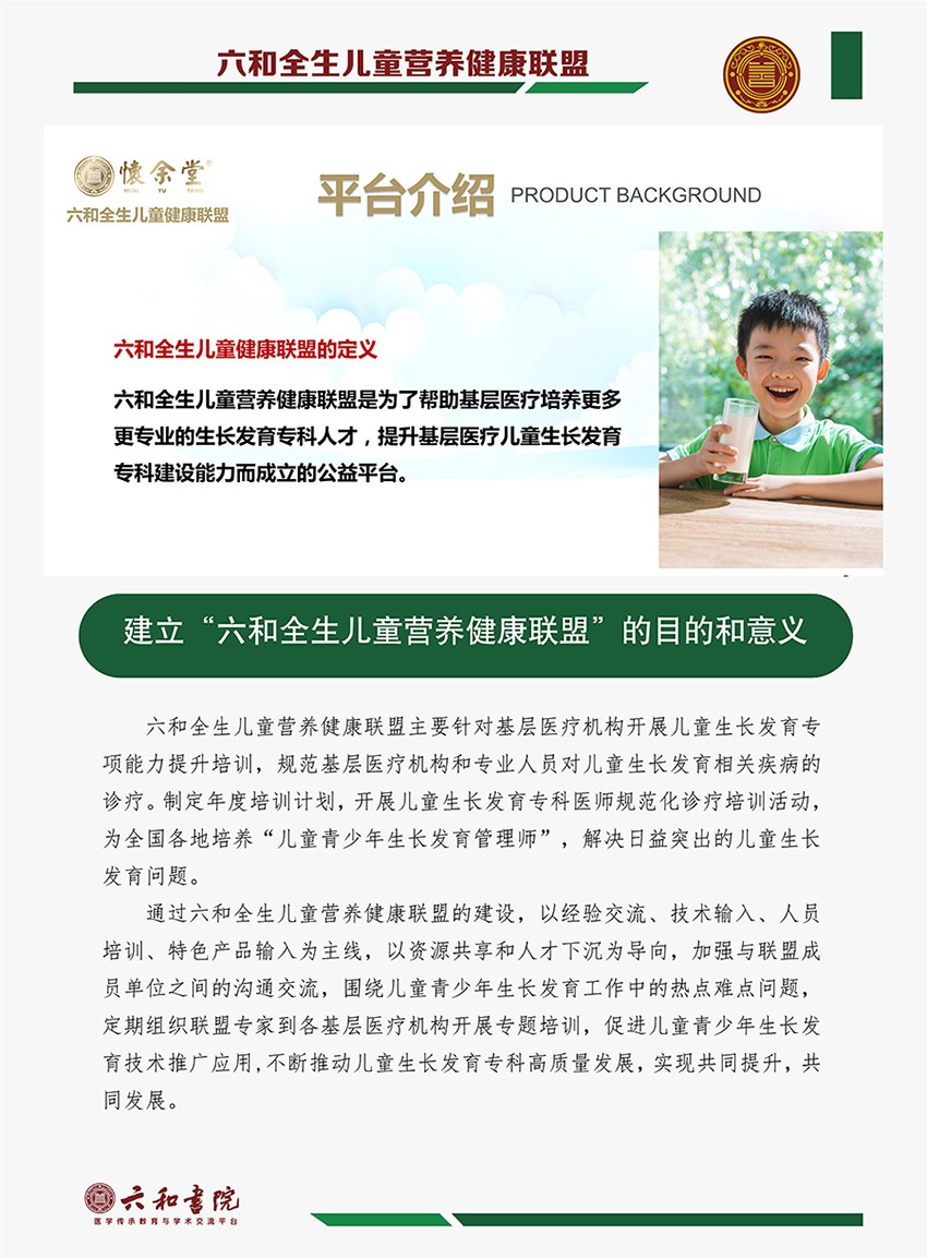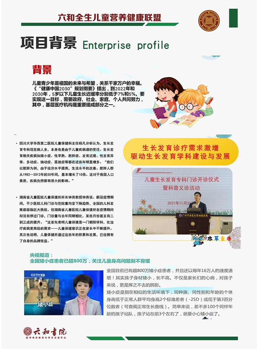 品牌名稱:六和全生 主營產(chǎn)品:六和全生療法,六和全生貼,六和全生營養(yǎng)素 品牌特色:綠色療法助發(fā)育 特膳營養(yǎng)促生長