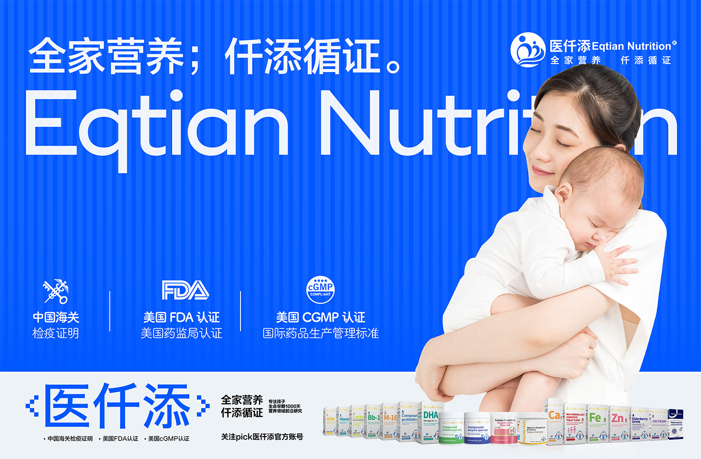 Eqtian Nutrition醫(yī)仟添系列產(chǎn)品均來自美國EQTIAN NUTRITION INC.企業(yè)生產(chǎn),堅(jiān)持采用天然原材料加工 ,嚴(yán)格把關(guān)每一道生產(chǎn)過程。產(chǎn)品都通過了美國權(quán)威FDA認(rèn)證,按照美國cGMP(國際藥品生產(chǎn)管理標(biāo)準(zhǔn))條例生產(chǎn)。醫(yī)仟添自成立以來,一直致力于對(duì)營養(yǎng)學(xué)與健康食品臨床研究與開發(fā)方面的努力探索,以科學(xué)的方式為千萬家庭傳播愛與健康,這是企業(yè)品牌文化使然,健康婦幼,營養(yǎng)先行。讓醫(yī)仟添守護(hù)每一個(gè)中國家庭的營養(yǎng)健康。愛之有道,計(jì)之深遠(yuǎn)——為孩子,也為自己!