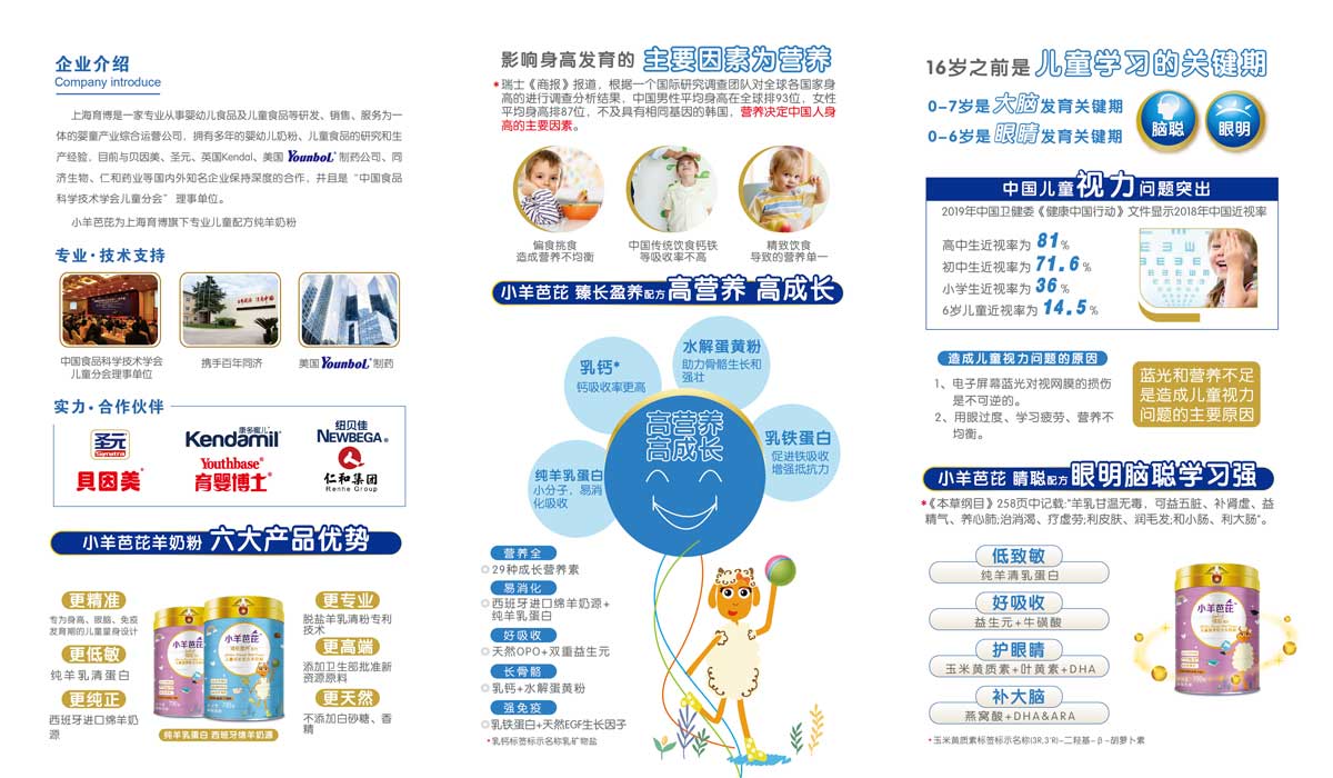 小羊芭芘為上海育博旗下專(zhuān)業(yè)兒童配方純羊奶粉,它是一家專(zhuān)業(yè)從事嬰幼兒食品及兒童食品等研發(fā)、銷(xiāo)售、服務(wù)為一體的嬰童產(chǎn)業(yè)綜合運(yùn)營(yíng)公司,擁有多年的嬰幼兒奶粉、兒童食品的研究和生產(chǎn)經(jīng)驗(yàn),目前與貝因美、圣元、英國(guó)Kendal、 美國(guó)YunboL制藥公司、同濟(jì)生物、仁和藥業(yè)等國(guó)內(nèi)外知名企業(yè)保持深度的合作,并且是“中國(guó)食品科學(xué)技術(shù)學(xué)會(huì)兒童分會(huì)”理事單位。