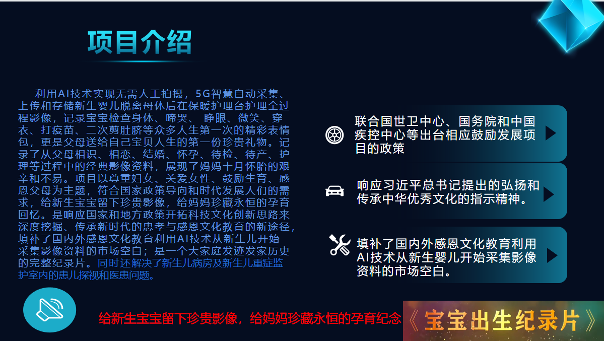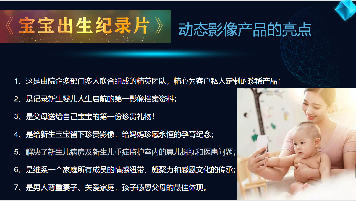 利用國家相關(guān)政策的支持,與婦幼婦產(chǎn)醫(yī)院合作,以AI技術(shù)自主研發(fā)的專利產(chǎn)品實現(xiàn)5G智慧采集新生兒影像資料,制作一部具有珍藏無價、永恒留戀、尊重婦女、關(guān)愛女性、鼓勵生育、感恩父母的動態(tài)影像——《寶寶出生紀錄片》。