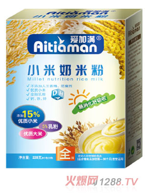 愛加滿小米奶米粉中含有三大成分:大米、15%的優(yōu)質(zhì)小米、5%的全脂乳粉。