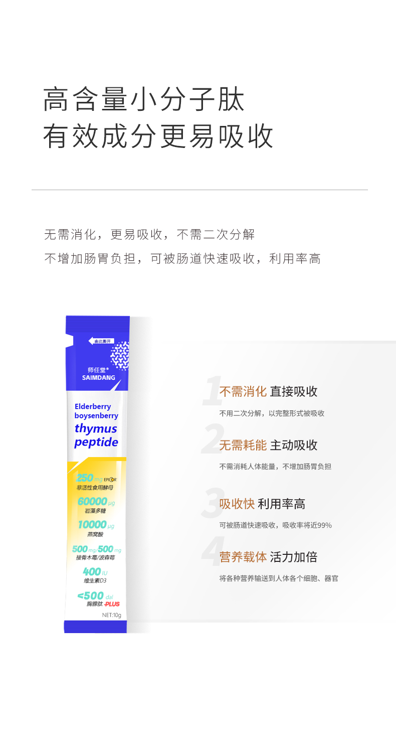 小袋包裝設計,隨吃隨開,避免氧化變質(zhì),方便攜帶,每天1條,輕松補充營養(yǎng)。師任堂接骨木莓+波森莓小肽飲憑借其安全、營養(yǎng)、便捷的特點,迅速成為兒童營養(yǎng)市場的熱門選擇,F(xiàn)誠邀全國渠道合作伙伴,攜手共贏,共同開拓兒童健康新藍海!