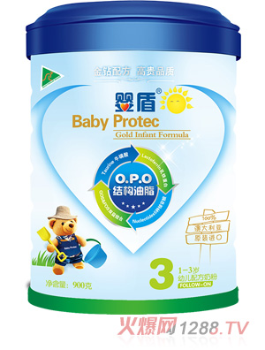 嬰盾OPO嬰兒配方奶粉,顧名思義,就是特別添加了OPO配方,柔和腸胃吸收能力;豐富的ARA和DNA成分有助于加強(qiáng)bao--bao的視力,大腦及神經(jīng)系統(tǒng);合理比例的乳清蛋白和豐富的膳食纖維,有幫助消化吸收。