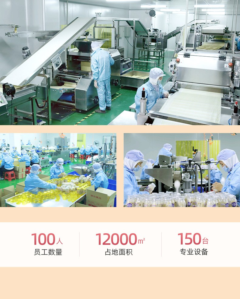 漳州童世界食品有限公司主營(yíng)一站式代加工OEM業(yè)務(wù),致力于健康兒童食品、功能性代餐食品、凍干燕窩的研發(fā)與生產(chǎn),公司占地面積12000平方米,始終秉承已科技為先導(dǎo)、以先進(jìn)的現(xiàn)代化管理依托、已“顧客滿意第一”為宗旨的經(jīng)營(yíng)方針、致力發(fā)展成為一家研發(fā)和制造健康、美味、營(yíng)養(yǎng)的食品企業(yè)。 公司的誠(chéng)信、實(shí)力和產(chǎn)品質(zhì)量獲得業(yè)界的認(rèn)可。歡迎各界朋友蒞臨參觀、指導(dǎo)和業(yè)務(wù)洽談。