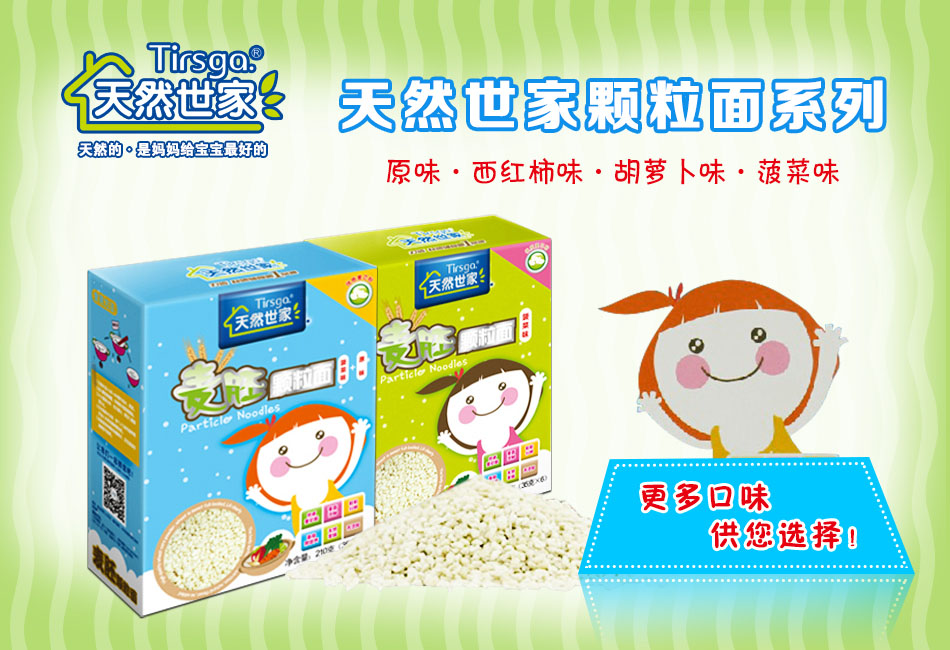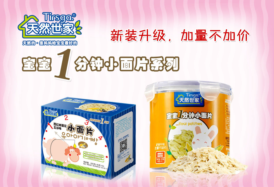 公司自主研發(fā)的“天然世家”系列“寶寶1分鐘小面片”上市伊始就受到了業(yè)界的一致好評,填補了國內在這個領域的空白,這一新品的上市更給各嬰童店的食品專柜創(chuàng)造了利潤增長點。產品好銷的原因一是改變了目前寶寶飲食單一的問題,二是解決了蝴蝶面中間不好熟,顆粒面煮面時間長等難題。